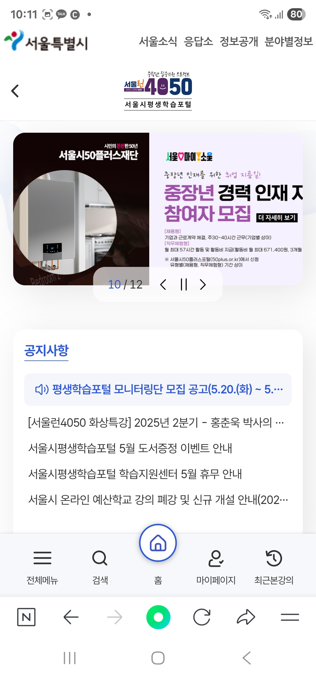 서울시 평생학습포털 접속 → 서울런4050 클릭