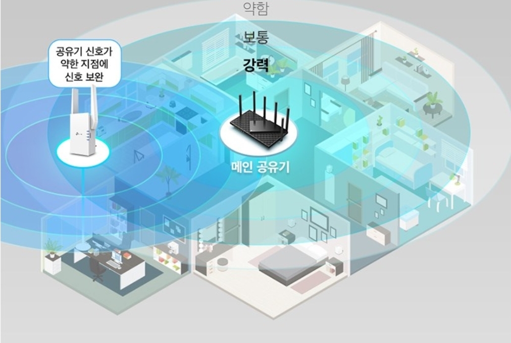 쉽게 말해서, ‘중계기’라고 생각하시면 이해하기가 쉬울 거에요. 공유기에서 멀어지는 만큼 약해지는 신호를 다시 멀리까지 전달해주는 역할을 하는 거죠.