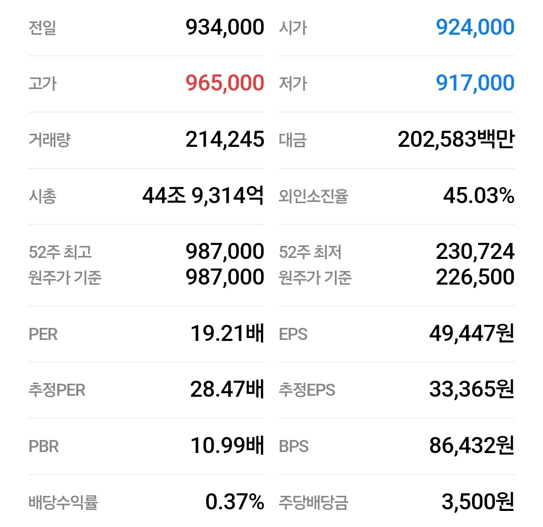 • 6월 18일 기준 주가는 96만8,000원으로, 최근 하루 동안 2.43% 상승했으나, 단기적으로는 1.96% 하락하는 등 변동성이 큰 모습입니다.