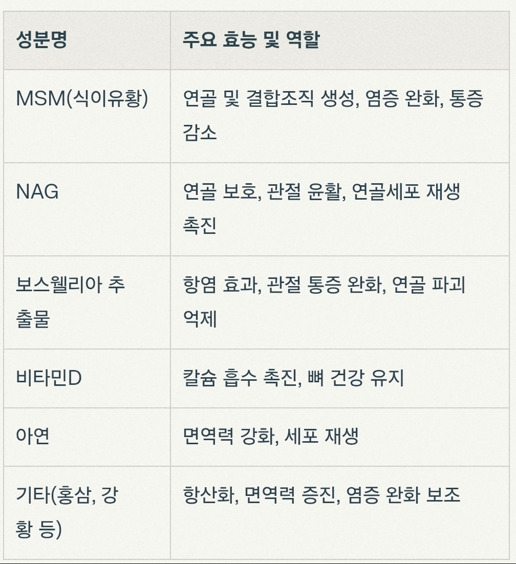 - 관절 및 연골 건강에 도움을 주는 다양한 성분 함유