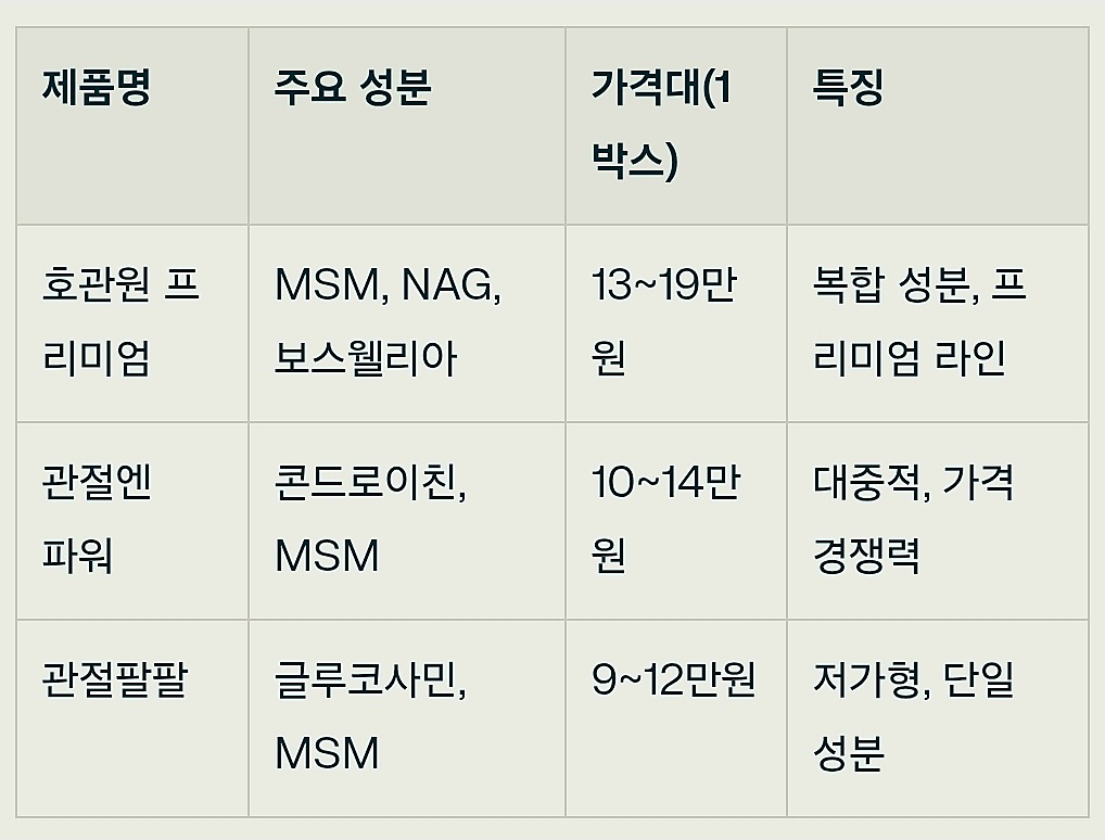 7. 호관원 프리미엄 vs 기타 관절 건강식품 비교