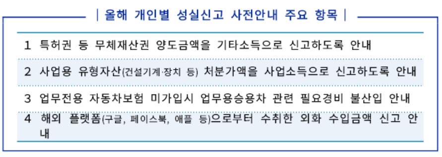 - 신고대상: 2024년 1월 1일 ~ 12월 31일 동안 사업·근로·임대·이자·배당 등 종합소득이 있는 모든 개인