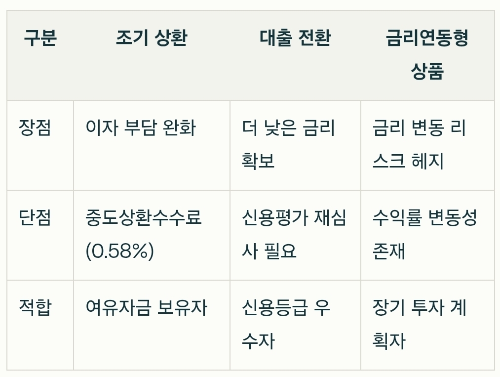 2025년 1월 개정된 중도상환수수료 제도(최대 0.58%) 하에서, 3억원 대출 조기상환 시 174만원 수수료 발생. 이 경우 금리 0.3%p 차이로 1년 이자 절감액(90만원)과 비교해 6개월 내 상환 하는 계획이 유리합니다.