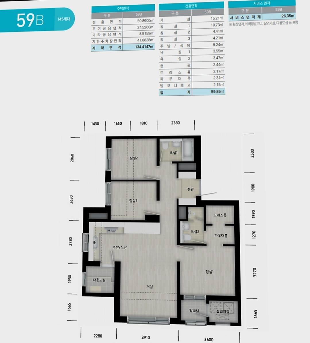 59㎡A타입은 방 3개, 주방, 거실, 욕실 구성의 4베이 구조로 맞통풍 및 남향 배치로 설계되었으며, 실내 환기와 채광이 우수한 것으로 평가가 됩니다.